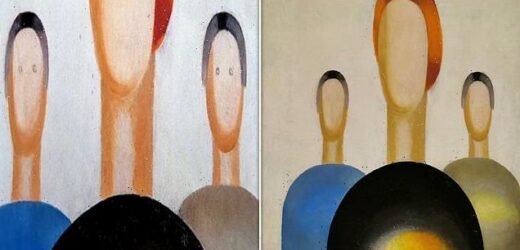 Two visitors enjoying an art exhibition called ‘The World as Non-Objectivity. The Birth of a New Art’ at the Yeltsin Center spotted the extra details to two of the three figures on the 1930s painting on December 7 last year, reports the Art Newspaper.
