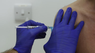 A Phase 3 Novavax coronavirus vaccine trial vaccine volunteer is given an injection at St George’s University hospital at in London. Credit:AP