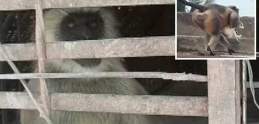 Images show the enraged primates locked in cages after the vicious revenge attacks carried out after a pack of dogs killed one of the monkey’s infants