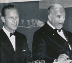 Prince Philip at dinner with then-prime minister Robert Menzies. The duke was in Melbourne to open the Olympic Games in 1956.Credit:Fairfax