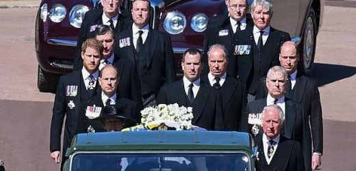 Six of Prince Philip’s loyal servants follow his coffin towards St George’s Chapel headed by the Duke’s right-hand man Brigadier Archie Miller- Bakewell