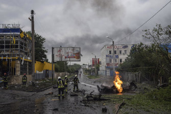 Rescue workers put out the fire of a destroyed car after a Russian attack in a residential area in Kharkiv.Credit:AP