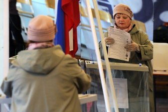 A woman reflected in a mirror casts her ballot during the State Duma, the Lower House of the Russian Parliament and local parliament elections at a polling station in Saint Petersburg, Russia.Credit:AP Photo/Dmitri Lovetsky