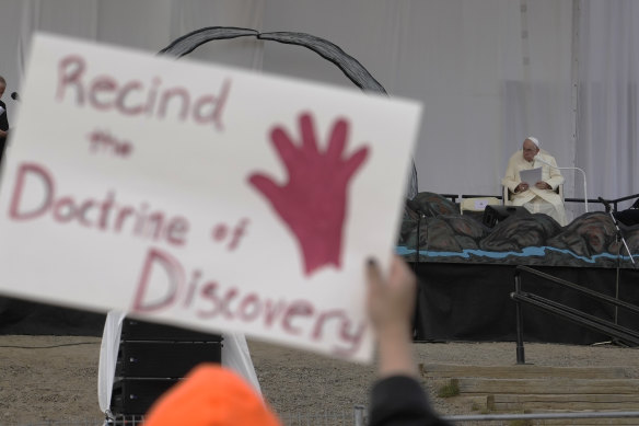 People protest as Pope Francis meets young people and elders at Nakasuk Elementary School Square in Iqaluit, Canada, last year.Credit:AP