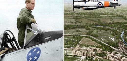 Soaring over Windsor Castle, this is the Duke of Edinburgh performing his own flypast of the mighty royal fortress (pictured)