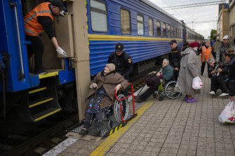 People fleeing from heavy shelling board an evacuation train at Pokrovsk train station, in Pokrovsk, eastern Ukraine, on Sunday.Credit: