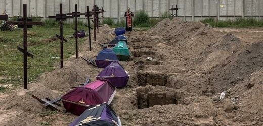 Bodies of 15 people shot in the head and chest and rolled into a mass grave in Ukrainian city of Bucha are reburied – as officials complete probe into Russian massacre