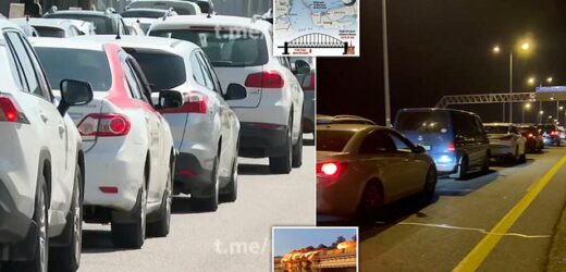 Russian fears over a deadly new bomb attack on a giant £3 billion bridge linking annexed Crimea to the Russian mainland triggered massive traffic jams today (pictured)