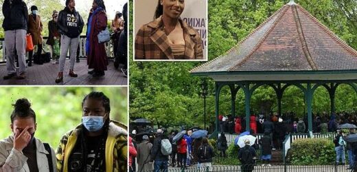 Demonstrators gathered at the bandstand in Ruskin Park, Lambeth, to ‘pray’ for Sasha Johnson, 27 – the self-styled ‘Black Panther of Oxford’ who called for the police to be defunded after the murder of George Floyd and helped lead the ‘Rhodes Must Fall’ campaign to topple controversial statues