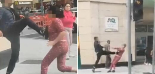 However, the two women continue to follow the attacker and he responds by kicking the woman in the pink pyjamas twice more.