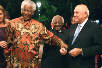 Tutu, centre, with Mandela and former president FW de Klerk at de Klerk’s 70th birthday party in Cape Town in 2006.Credit:AP