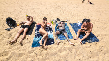 A group of four young sunbathers, also without masks and sprawled out on towels, said they had ridden their bikes down to the beach and stopped for a swim.