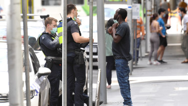 Police offices in the city stop a man and ask him to put on a mask.Credit:Joe Armao