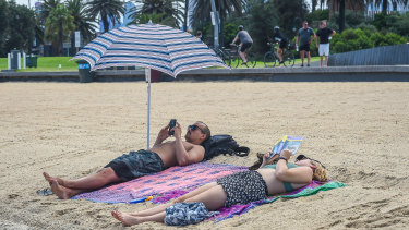 People relax at St Kilda beach during COVID-19 lockdown on Tuesday.Credit:Justin McManus