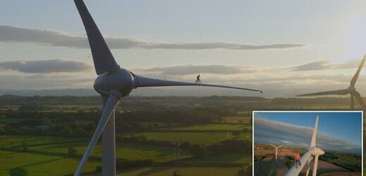 During the clip, the cyclist stands at the top of the turbine before edging his bike onto the blade – while attached to a rope.