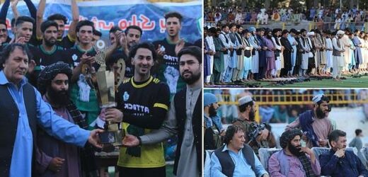 Prayer is performed on the pitch at half-time of the match in Herat. There is mounting evidence that the hardline Islamist regime is anything but reformed from the despotic jihadists of 20 years ago, who brutally oppressed women and allied themselves with Al Qaeda terrorists