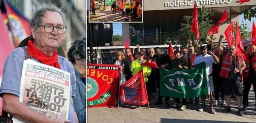 Unite West Midlands shared a picture on Twitter this morning of workers gathered outside Coventry station this morning waving the green flags of Lynch’s RMT union and a red National Education Union banner which read: ‘Unity is strength’.