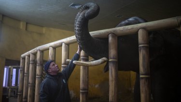 Animal keeper Kirilo Trantin comforts an elephant at the Kiev Zoo in Kyiv, Ukraine. Credit:Emilio Morenatti/AP
