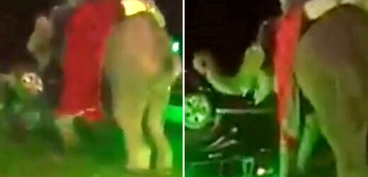 Footage shows the massive elephant flipping cars and trashing the venue after it got startled by the noise.