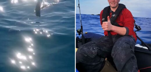 Alone at sea, the 21-year-old filmed the incredible encounter as the 6ft Porbeagle shark zipped around his boat.
