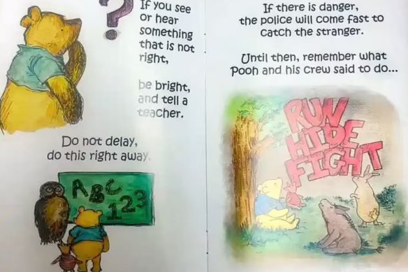 Featuring the popular children’s bear, the material states that: “If there is danger, let Winnie-the-Pooh and his Crew show you what to do: Run Hide Fight.”