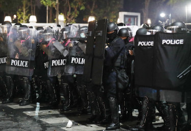 Hundreds of police in riot gear and shields advanced on different fronts against protesters to push people away from the Grand Palace. In some places they faced off with protesters who threw firecrackers.