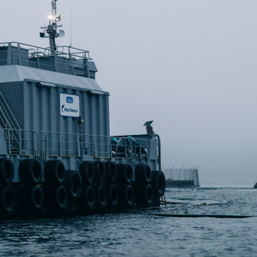 A feeding barge at the Tassal salmon farm on the D’Entrecasteaux Channel houses a diesel plant that powers automated fish feeding. Noise from the site causes distress for the nearby Killora community.Credit:Adam Gibson
