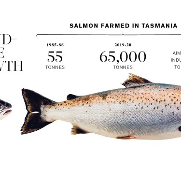 We’ve imbibed the message and our appetite for Atlantic salmon – which is only farmed here as Atlantic salmon is not native to our waters – has helped fuel the industry’s growth. (Australian salmon, a wild-caught, coastal fish, is unrelated to Atlantic salmon.) What started as a boutique operation producing 55 tonnes of salmon in 1985-86 has expanded to become a key Tasmanian industry that in 2019-20 produced about 65,000 tonnes of fish, farmed on 2670 hectares of sea across seven marine zones.