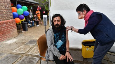 Andrew gets vaccinated at the Salvation Army’s Flagstaff Crisis Accommodation Centre.Credit:Joe Armao
