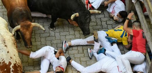 Hundreds of runners sprinted through the the Spanish city’s narrow cobblestoned streets ahead of six fighting bulls.
