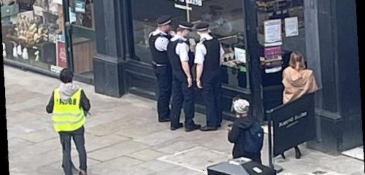 Those cakes make an arresting sight! Three PCSOs gaze hungrily into fancy patisserie window – missing the e-scooter rider on the pavement behind them