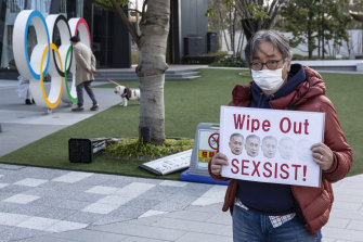 A man holds a placard with pictures of Tokyo Games boss Yoshiro Mori during a protest in Tokyo.Credit:Getty Images