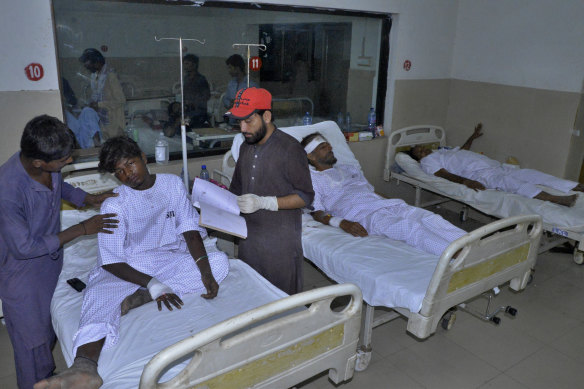 Injured victims of a passenger train derailed incident, are treated at a hospital, in Nawabshah, Pakistan.Credit: AP