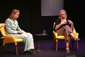 Grace Tame and Rosie Batty on stage in Sydney.Credit:James Alcock
