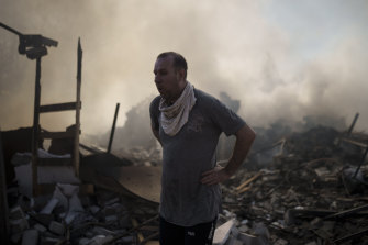 A neighbour pauses as he tries to extinguish the fire of a house, destroyed after a Russian attack in Kharkiv.Credit:AP Photo/Felipe Dana