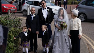 Stella Moris, the partner of Wikileaks founder Julian Assange, is photographed in her Vivienne Westwood dress, with their sons Max, 3, and Gabriel, 4, before driving to Belmarsh Prison to marry Assange.Credit:AP