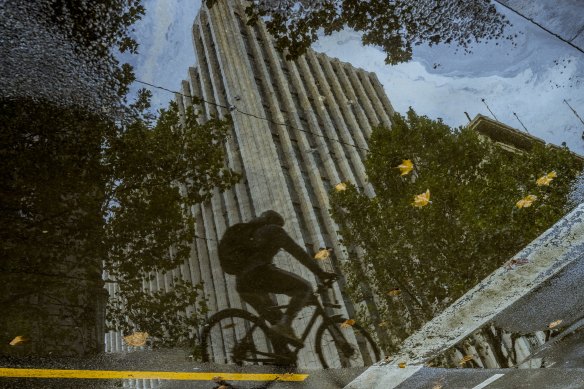 Cloudy skies and rain puddles in Melbourne’s CBD on Monday. Credit: Chris Hopkins