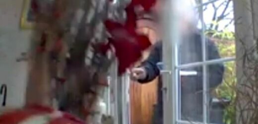 THIS is the shocking moment a clumsy Evri delivery driver knocked over a vase as he kicked a parcel through the door.