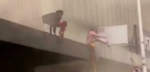 Natedi Manyoni is seen climbing down to the ledge with the girl after fleeing her 16th-floor apartment in Durban on Tuesday, then dropping the youngster to a group of men below.