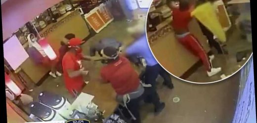 Wild video shows two irate Bronx Popeyes customers pummeling another man — including with a “Wet Floor” sign — following a dispute over who was supposed to be served first, according to the NYPD.