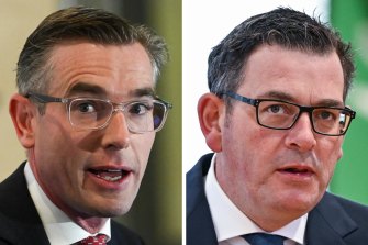 NSW Premier Dominic Perrottet (left) will switch out stamp duty in his June budget, while Victorian Premier Daniel Andrews would not confirm whether he would follow suit.Credit:Flavio Brancaleone, Joe Armao